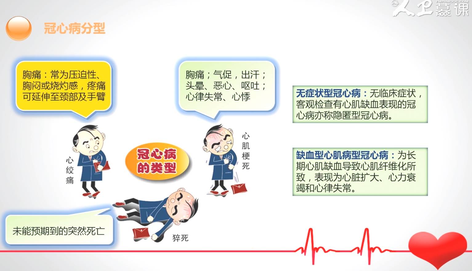 5. 缺血型心肌病型冠心病: 主要為長期心肌缺血導(dǎo)致心肌纖維化所致,表現(xiàn)為心臟擴大、心力衰竭和心律失常。