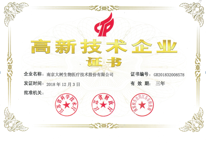 近日,我公司獲得由江蘇省科學(xué)技術(shù)廳、江蘇省財(cái)政廳、國(guó)家稅務(wù)總局江蘇省稅務(wù)局聯(lián)合頒發(fā)的“高新技術(shù)企業(yè)”證書,由此正式邁入國(guó)家高新技術(shù)企業(yè)行列。南京大樹生物醫(yī)療技術(shù)股份有限公司是一家集研發(fā)、生產(chǎn)、銷售為一體的專業(yè)體外診斷試劑醫(yī)療器械公司,公司秉承“質(zhì)量為先、信譽(yù)為重、以人為本、精益求精”的質(zhì)量方針,通過我們的專業(yè)技能和不懈努力竭力為廣大客戶提供創(chuàng)新優(yōu)質(zhì)的產(chǎn)品及完善的售后服務(wù)!